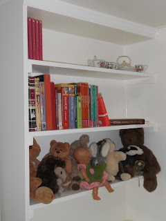 Her new shelves I built at the foot of her bed. She was is desperate need of bookshelves and something to take up the extra space in her built-in bed. I also repainted the entire room, put in crown molding, and rehung her closet doors. (This was taken before I put the doors in.)
