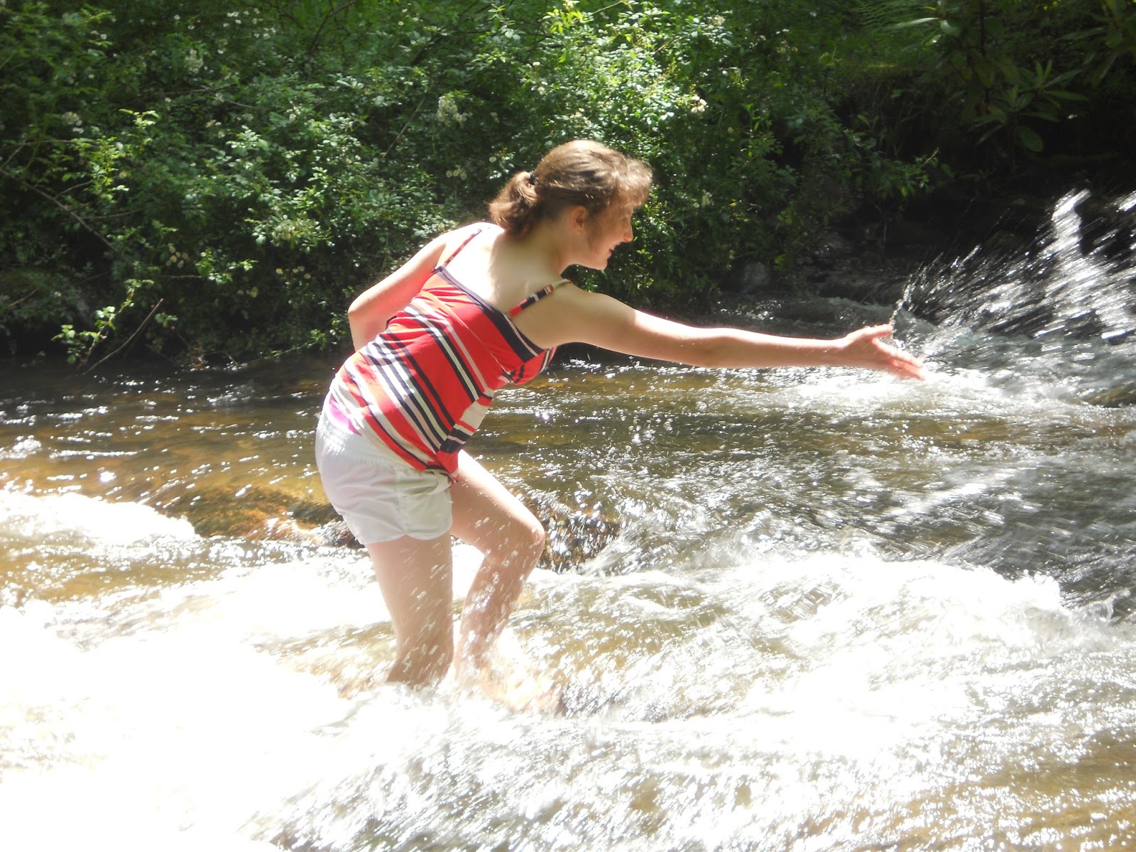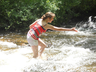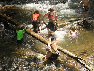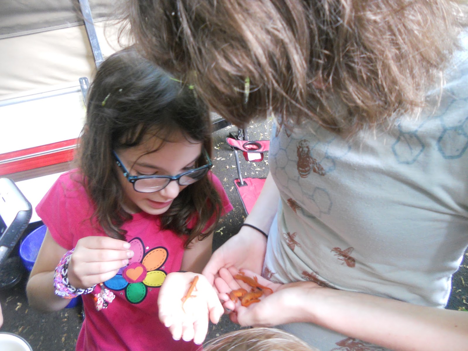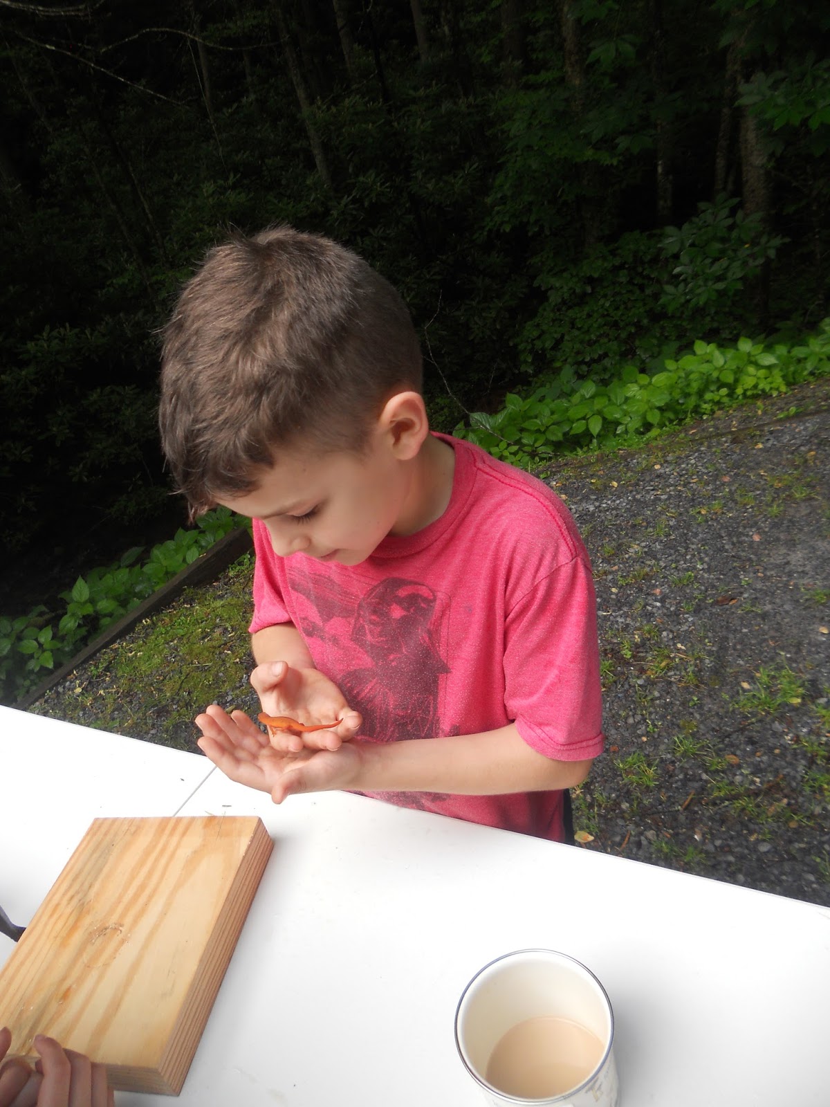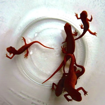 The next day was beautiful, and the kids discovered that this was the ideal habitat for red-spotted efts. They showed up at the camp site with their hands overflowing with the little orange salamanders.
