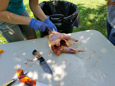 Today I woke up, rounded up three of my chickens, and went to a friend's house to butcher chickens. We did three of mine, and about a dozen of hers. The last chicken I butchered took hours for just one chicken, so I had no idea how long this was going to take. I did know that I wasn't going to pluck this many chickens. I do not pluck well.