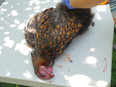 Cutting off the head is hard. I do not look at the actual head as I am doing it, but just concentrate on the neck. Once the head is gone, then the connection I felt towards the living breathing animal is less, and it is now a hunk of meat that I can process without feeling sorry for it. This particular chicken's name was Buttercup. She was a pretty chicken that gave us good eggs, but unfortunately she and the other two Wyandottes, were relentless bullies that made life for all of our hens unbearable. I felt that the responsible thing to do was to kill them and use their meat, so that their lives were not wasted.