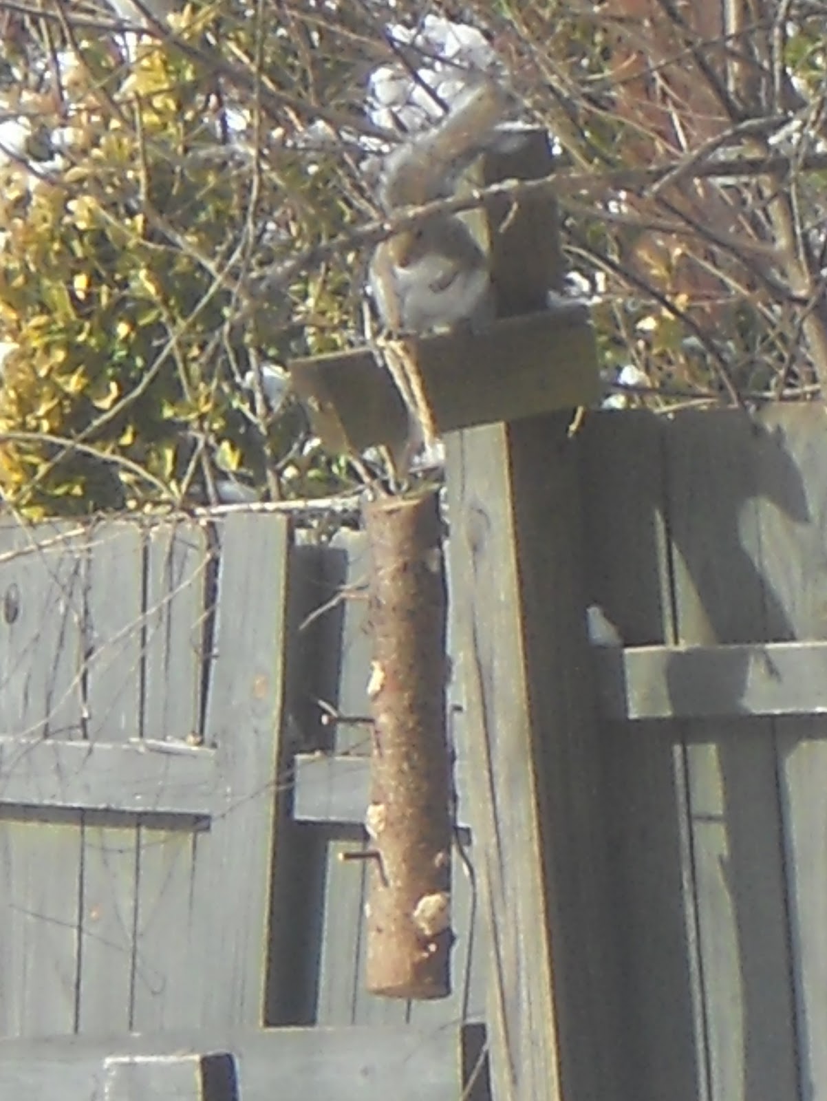 Yesterday in the snow, we saw this ambitious fellow getting what he could out of it, and today he seemed to have staked his claim on the feeder; noisily chattering and swishing his tail at the birds.
